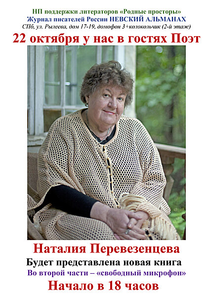 События c заседания клуба сатиры и юмора«Здоровый смех»События c Фестиваля поэзии и авторской песни«Встречи друзей»В КЛУБЕ МАСТЕРОВ ПЕРА 22 октября состоялось очередное занятие в «Школе литературного мастерства». Своими знаниями и творческим опытом в этот вечер делилась поэт Наталия Анатольевна Перевезенцева. Она родилась в Ленинграде, живет в Петербурге. По профессии — инженер-оптик, по роду занятий — литератор, журналист. Состоит в Союзе писателей СПб и в Союзе писателей России. Автор пяти книг стихов (шестая – в типографии), шести книг по истории Петербурга и области. Стихи, переводы и эссе печатались в журналах Санкт-Петербурга, России, ближнего и дальнего зарубежья. Постоянно участвует в передачах Радио России, а также в ряде телевизионных проектов. Дипломант конкурса «Золотое перо»-2006, лауреат нескольких литературных конкурсов. Чтение хороших стихов – это лучшая литературная учёба. Поэтому в редакции журнала «НЕВСКИЙ АЛЬМАНАХ» целый вечер звучали прекрасные стихи Наталии Перевезенцевой. Предлагаем вашему вниманию фоторепортаж с места события. Авторы фотографий – Сергей Нестор и Кирилл Белянкин. ![]() Наталия Анатольевна Перевезенцева ![]() Информационный уголок ![]() Новая книга Поэта. ![]() Стихи из новой книги... ![]() Все слушают Стихи Поэта... ![]() Сергей Нестор увековечивает событие ![]() Звучат жизнерадостные стихи... ![]() Весёлый смех коллег! ![]() Стихи из книги... ![]() Живое общение коллег... ![]() Аплодисменты коллег!!! ![]() Раздача автографов ![]() Цветы Поэту!!! ![]() Автографы для друзей. ![]() Обложка книги Н. Перевезенцевой. ![]() Заинтересовал журнал НЕВСКИЙ АЛЬМАНАХ... ![]() Фото на память... ![]() Афиша мероприятия 22.10.2025 В «НЕВСКОМ АЛЬМАНАХЕ» ВСПОМИНАЮТ… 9 октября в редакции журнала НЕВСКИЙ АЛЬМАНАХ состоялся Вечер памяти, посвящённый 85-летию Н. П. Утехина. Николай Павлович Утёхин – критик, литературовед, публицист. В 1967 окончил филологический факультет ЛГУ. В 1969 стал редактором литературно-драматического вещания на Ленинградском радио. С 25.12.1969 по 1.12.1980 работал младшим научным сотрудником в Секторе советской литературы в ИРЛИ (Пушкинский Дом) АН СССР. Занимался вопросами теории и истории советской литературы, изучал творчество А. Твардовского и М. Булгакова. В 1976 защитил кандидатскую диссертацию «Принципы типологии эпических форм и проблема жанра повести». Однако академическая деятельность не удовлетворяла деятельную натуру Утёхина. Он принимает решение перейти из «Пушкинского Дома» на работу в «Лениздат». В 1980 г. Н.П. Утёхин становится зав. редакцией художественной литературы издательства. С 1980 и до начала перестройки Утёхин руководил редакцией и определял издательскую политику тех лет. Вечер памяти Н.П. Утехина прошёл в тёплой дружественной обстановке. Предлагаем вашему вниманию фоторепортаж с места события. Автор фотографий Сергей Игнатьев ![]() Информационный уголок ![]() Вечер вёл друг Утехина А.И. Соловьёв ![]() Творческие люди Петербурга ![]() Александр Илларионович рассказывает... ![]() На фото Утехин в роли Николая II ![]() Рассказывает коллега Утехина по работе... ![]() И вновь Александр Соловьёв... ![]() Люди, знавшие Утехина... ![]() Вспоминает Владимир Скворцов ![]() Вспоминаются весёлые моменты общения... ![]() И коллегам приятно слышать о весёлом... ![]() Александр Илларионович завершает вечер. КЛУБ ЖИЗНЕРАДОСТНЫХ ЛЮДЕЙ! Вечером 7 октября в конференцз