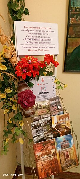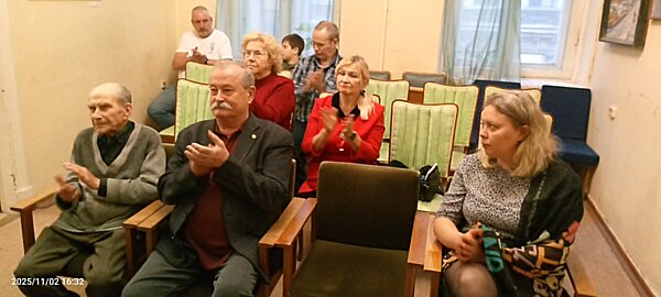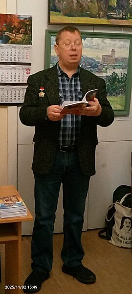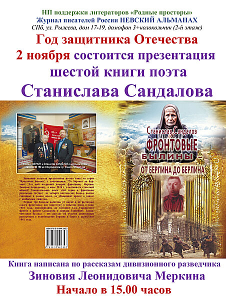 Ветеран войны в Афганистане о ветеране Великой Отечественной… Презентация шестой книги поэта Станислава Сандалова 2 ноября в редакции журнала «Невский альманах» состоялась презентация книги о войне, которая написана по рассказам дивизионного разведчика Зиновия Леонидовича Меркина – почётного жителя Санкт-Петербурга. В зале собрались участники боевых действий, ветераны армии и флота, прозаики, поэты и публицисты… После того, как Станислав Сандалов закончил чтение глав своего нового труда, своими впечатлениями о книге поделились Владимир Скворцов, Олег Столяров, Алла Таирова, Татьяна Черных, боевой товарищ поэта Сандалова по Афганистану. Встреча прошла в тёплой дружественной обстановке. Сандалов Станислав Германович родился в Казани. После окончания школы поступил в Театральное училище на актёрский факультет. Со второго курса был призван в ряды СА. Служил в Афганистане командиром гаубицы Д-30. Был легко ранен, в результате получил тяжёлую гангрену ноги. После излечения вернулся к службе. В 1989 году закончил Театральное, по распределению прибыл в Ленинград в театр-студию "Карусель", отработал актёром до июля 1992 года. Окончил психолого-педагогический факультет РПГУ им. А. Герцена в 2000 г. Издал 5 поэтических книг о войне. Лауреат литературных премий им. Генералиссимуса А. В. Суворова и А. Т. Твардовского, член Многонационального Содружества писателей. Предлагаем вашему вниманию фоторепортаж с места события. Автор фотографий Сергей Игнатьев. ![]() Сандалов читает главы из книги ![]() афиша мероприятия ![]() Книги Станислава Сандалова ![]() Автор читает своё произведение... ![]() Друзья и коллеги писателя... ![]() Сандалов продолжает... ![]() Подросток знакомится с книгой Сандалова... ![]() Звучат проникновенные стихи... ![]() Аплодисменты Сандалову ![]() О достоинствах книги говорит кфн Олег Столяров. ![]() Впечатланиями о книге делится Татьяна Черных ![]() О достоинствах книги Владимир Скворцов... ![]() Впечатлениями делится ветеран боевых действий... ![]() Аплодисменты автору книги!!! О ПОБЕДЕ ВО ВЕСЬ ГОЛОС В библиотеке имени А. Молчанова состоялась творческая встреча с авторами старейшего журнала России НЕВСКИЙ АЛЬМАНАХ. Со сцены звучали стихи и песни, посвящённые 80-летию Великой Победы. Предлагаем вашему вниманию фоторепортаж с места события. Авторы фотографий Ирина Враник и Марианна Соломко. ![]() Открыла вечер поэт Светлана Горецкая ![]() Аплодисменты ведущей ![]() Выступает поэт Владимир Скворцов ![]() Лучшая поэтесса Петербурга Марианна Соломко ![]() Звучат стихи Марианны Соломко ![]() Восторженные бурные аплодисменты!!! ![]() Патриотические песни поёт Александра Тарновская ![]() Выступает Ирина Авакова ![]() Михаил Иноземцев ![]() Татьяна Фролкина ![]() Стихи читает Галина Демченко (г.Луга) ![]() Друзья и авторы журнала Книга, посвящённая 80-летию Великой Победы 8 мая в редакции журнала «Невский альманах» состоялась презентация книги, посвящённой 80-летию Великой Победы. Автор произведения – известный писатель, художник, альпинист, изыскатель, исследователь Александр Дмитриевич Крячун. В зале собрались прозаики, поэты и публицисты, а также поклонники документальной современной литературы. Встреча прошла в тёплой дружественной обстановке. Предлагаем вашему вниманию фоторепортаж с места события. Автор всех фотографий – Сергей Нестор. ![]() Александр Крячун ![]() Александр Кря